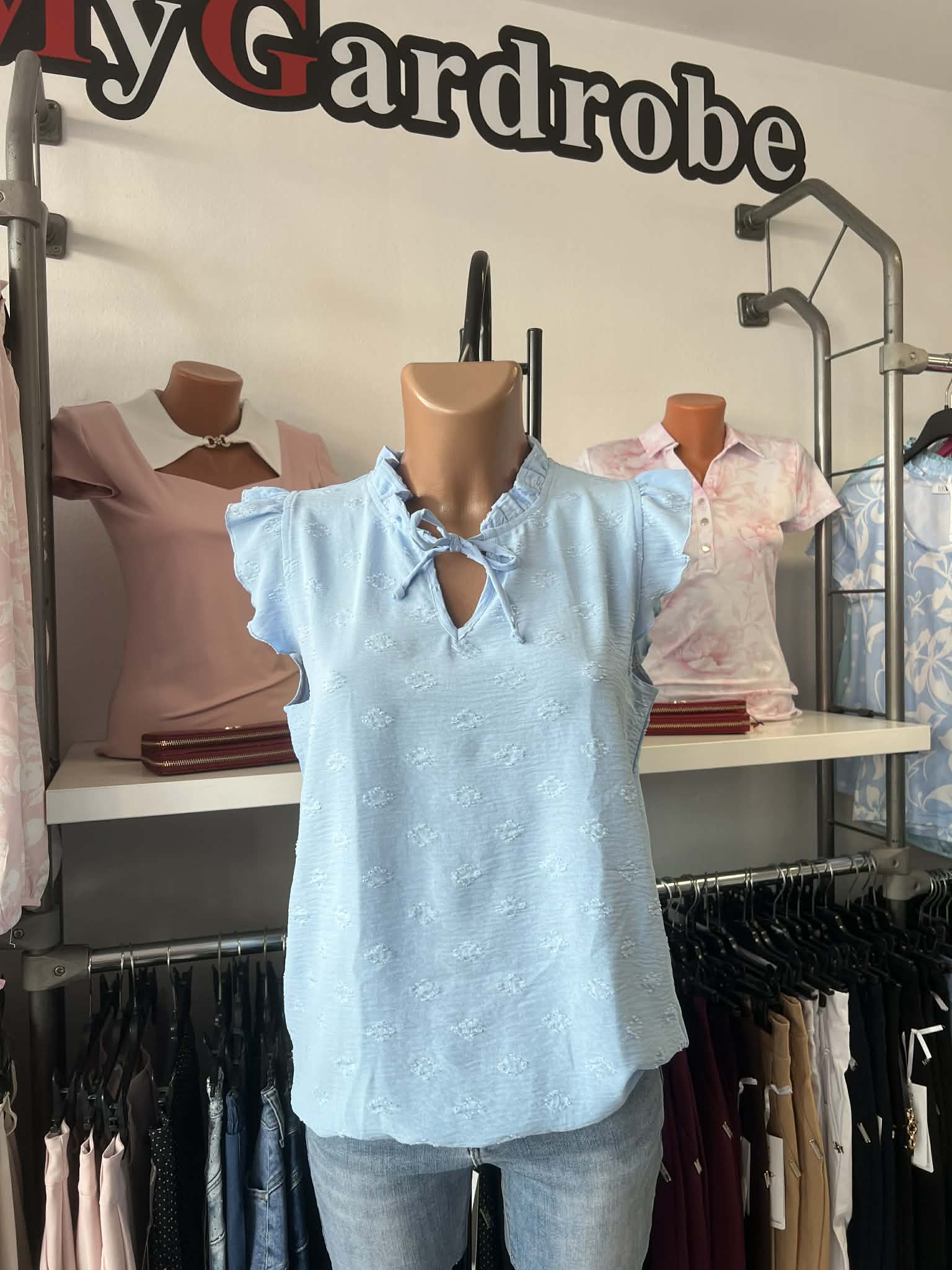 Elöl kivágott és masni köthető, bővebb, alul gumis, poliészter anyagú felső. Méret: S