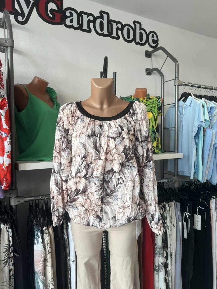 Vállra húzható, gyűrt, alul passzés, ujja gumis, poliészter viszkóz elasztán anyagú felső. Méret nélküli.