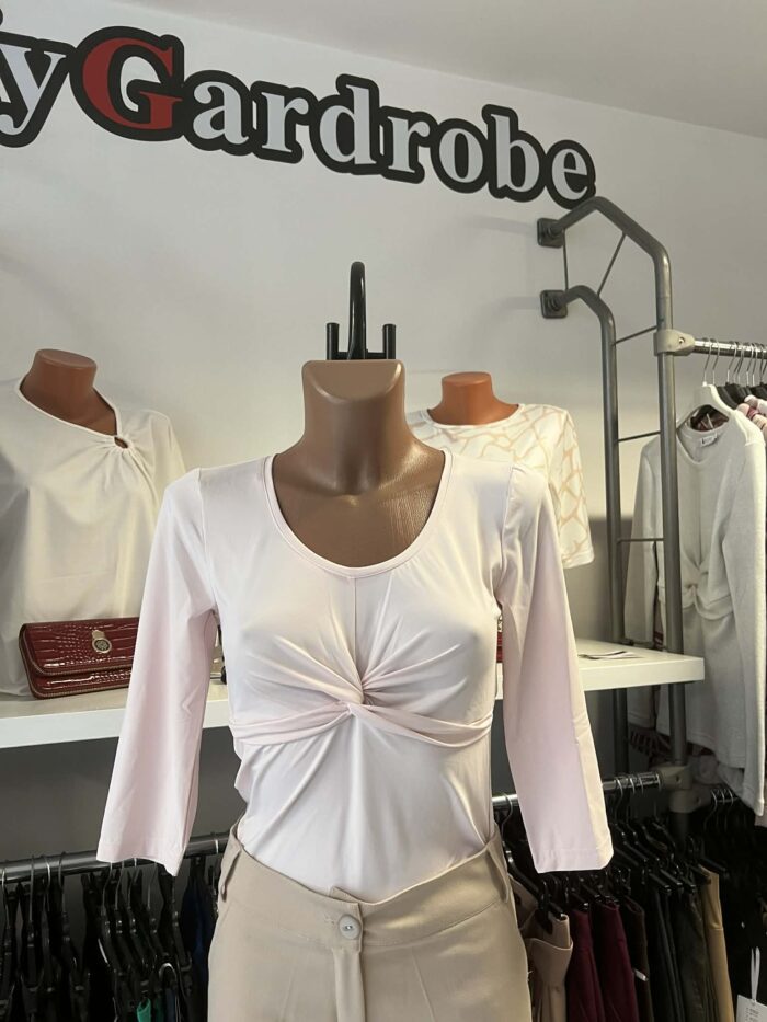 Elöl csavart, háromnegyedes ujjú, poliamid lycra anyagú felső.