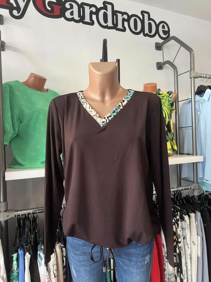 Elöl kivágott, bővebb, alul kötős, poliészter viszkóz elasztán anyagú felső.