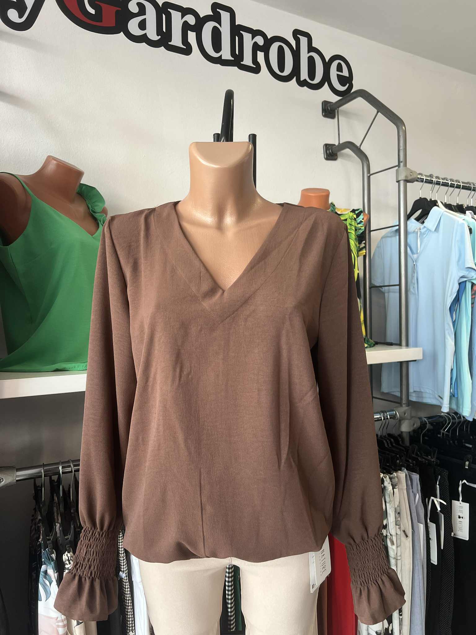 Elöl kivágott, bővebb, alul és ujja gumis, poliészter anyagú felső.
