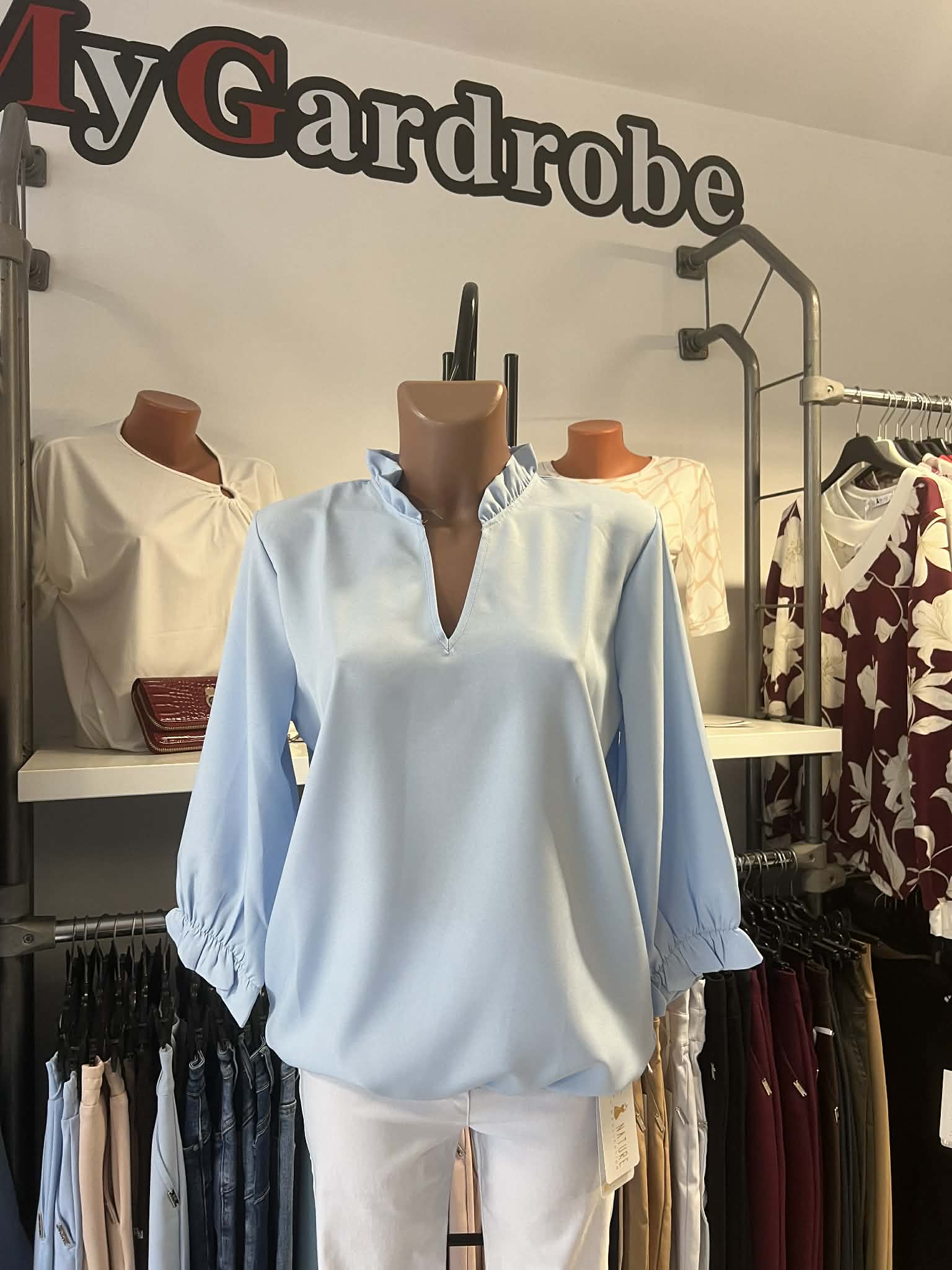 Elöl kivágott, nyakánál és ujján húzott, alul gumis, bővebb, poliészter spandex anyagú felső.