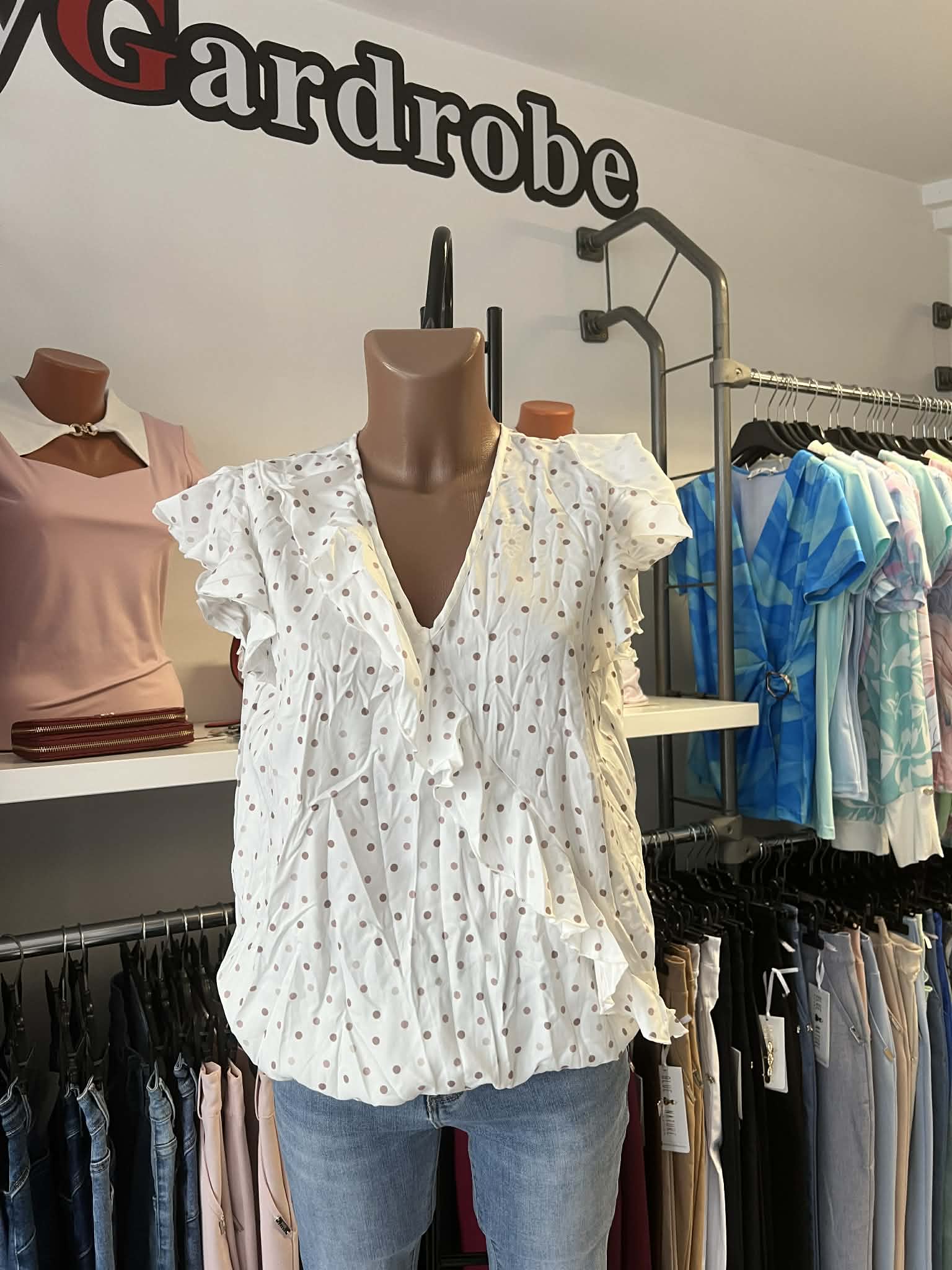 Elöl kivágott, fodros, bővebb, alul gumis, gyúrt, poliészter spandex anyagú felső.