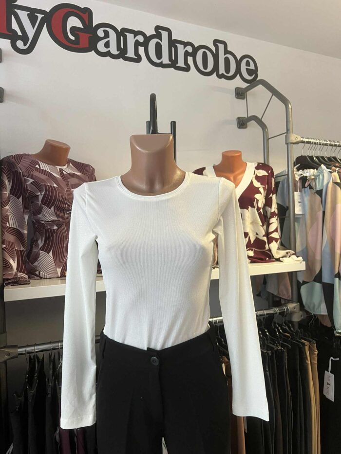 Kerek nyakú, poliészter viszkóz elasztán csillogós anyagú felső.
