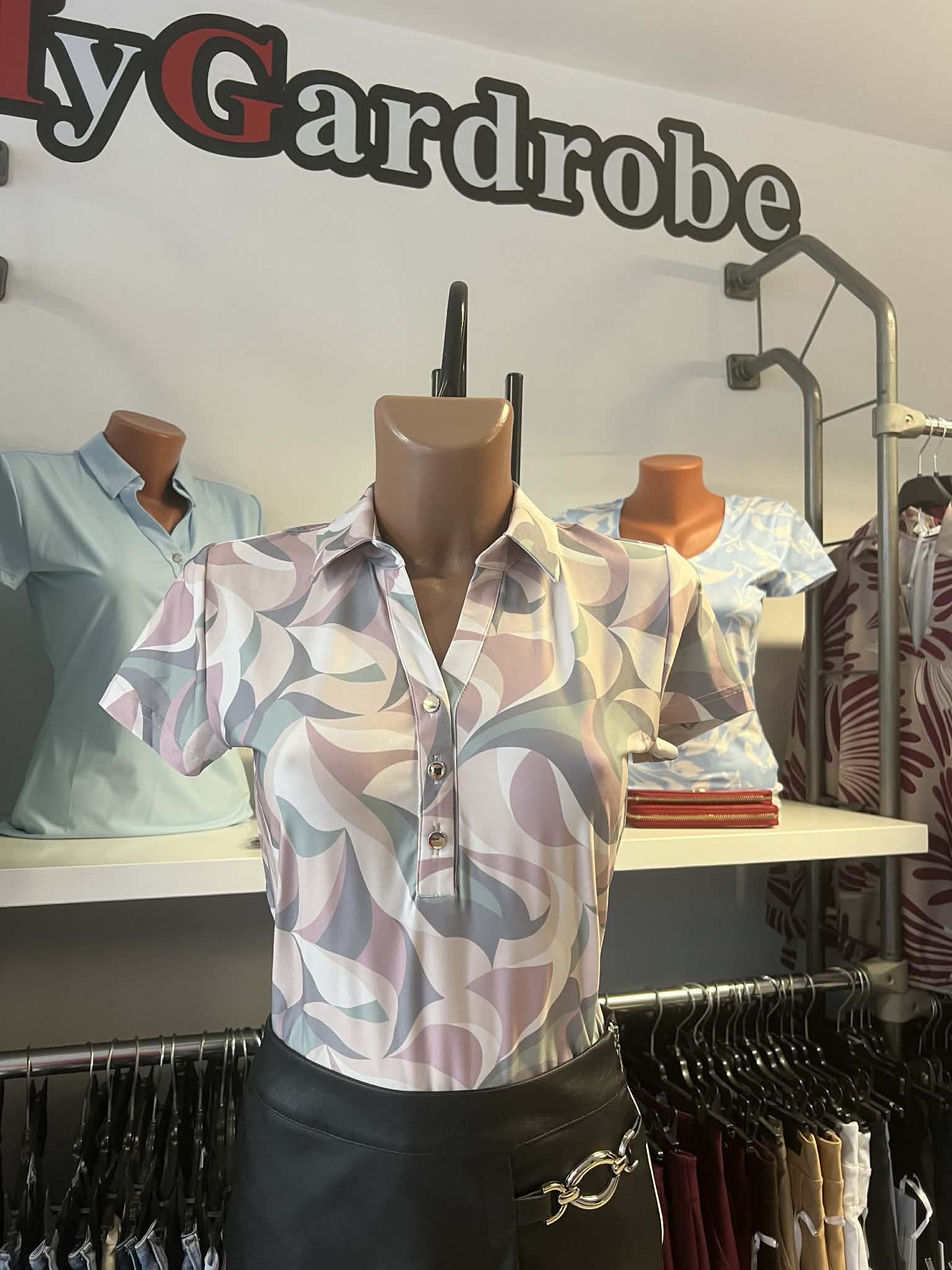 Elöl kivágott és háromgombos, poliamid lycra anyagú felső.