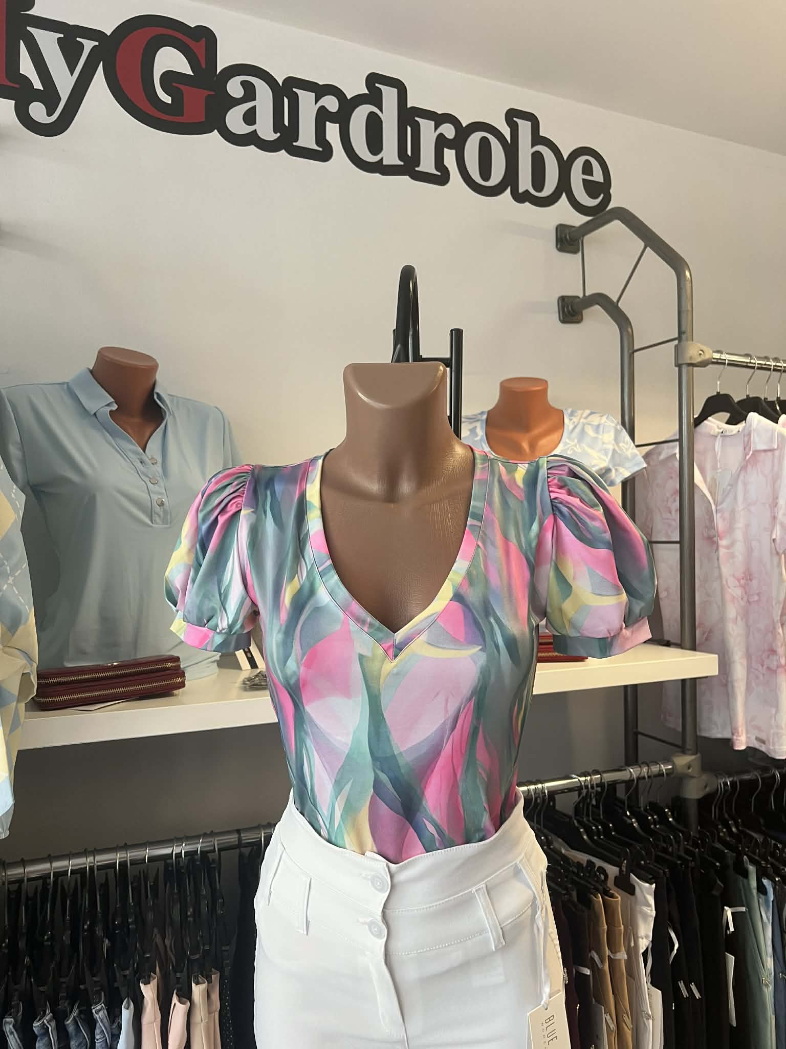 Elöl kivágott, vállán húzott, poliamid lycra anyagú felső.