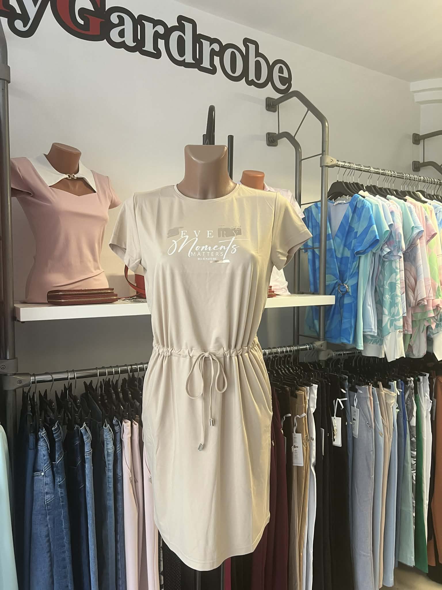 Elöl nyomott mintás, zsebes, kötős, poliészter viszkóz elasztán anyagú ruha.
